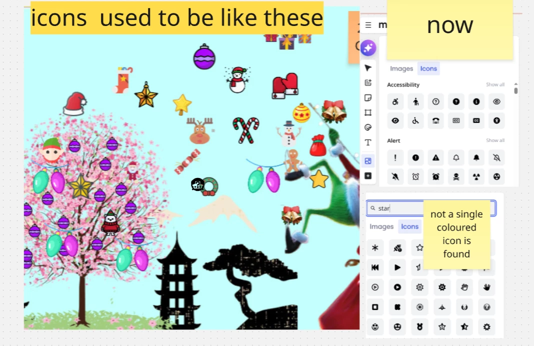 As a teacher, I wanted to make educational game boards again, but discovered that the icon library selection has been significantly reduced — no animals, festive icons, nature elements, water objects, or many other categories that were previously available.