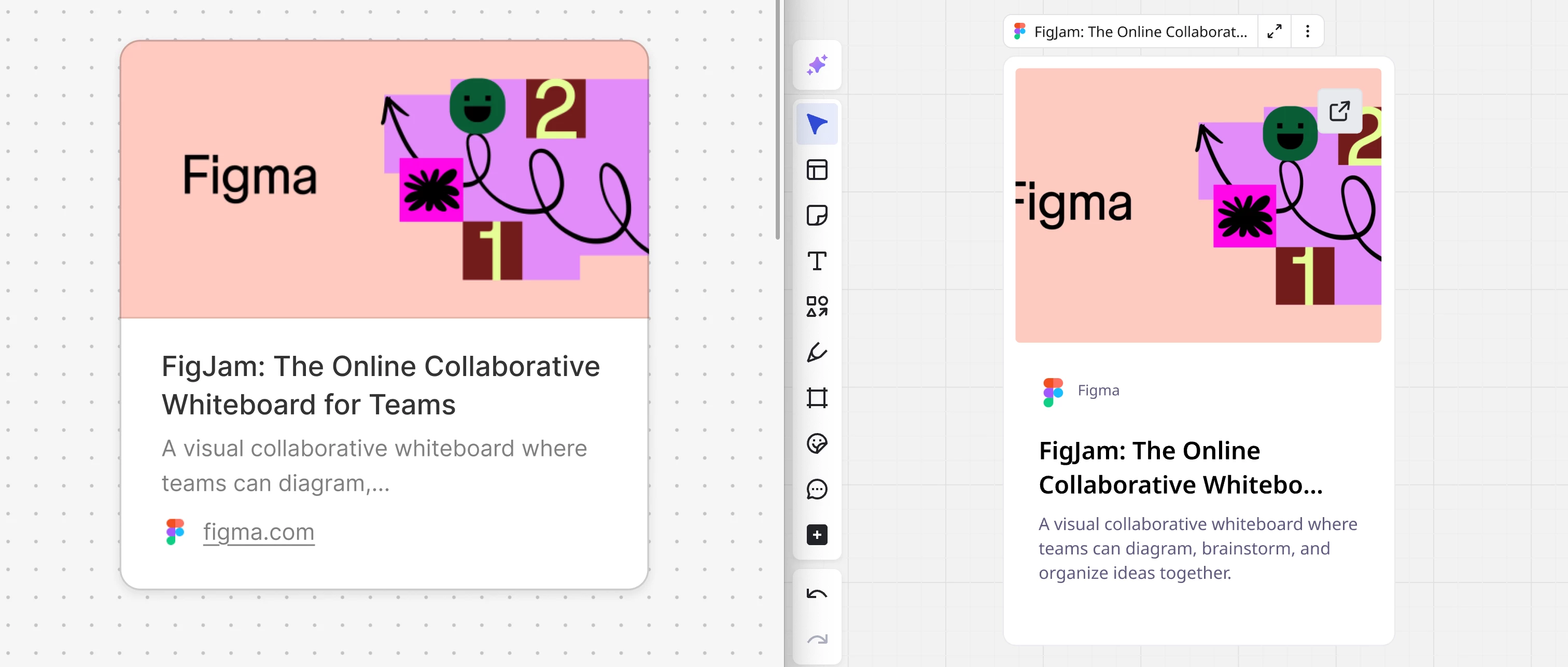 Part of what personally bothers me so much about this change, is that I cannot really see any advantage of the new design. My only theory is that it was chosen to make the interface look more “fun” and “friendly” rather than “efficient” and “information-dense”, which may be an attempt at approximating the style of what I assume is their main competitor. Ironically for me this change was the reason to try out and for now move over to this other platform. While I prefer the more business-like and professional look of Miro, this other platform is at least consistent with their “fun” look. And they even manage this style while being more information dense than Miro’s new design. Below is an example, showing how much less space is wasted on the embed cards on the other platform.
