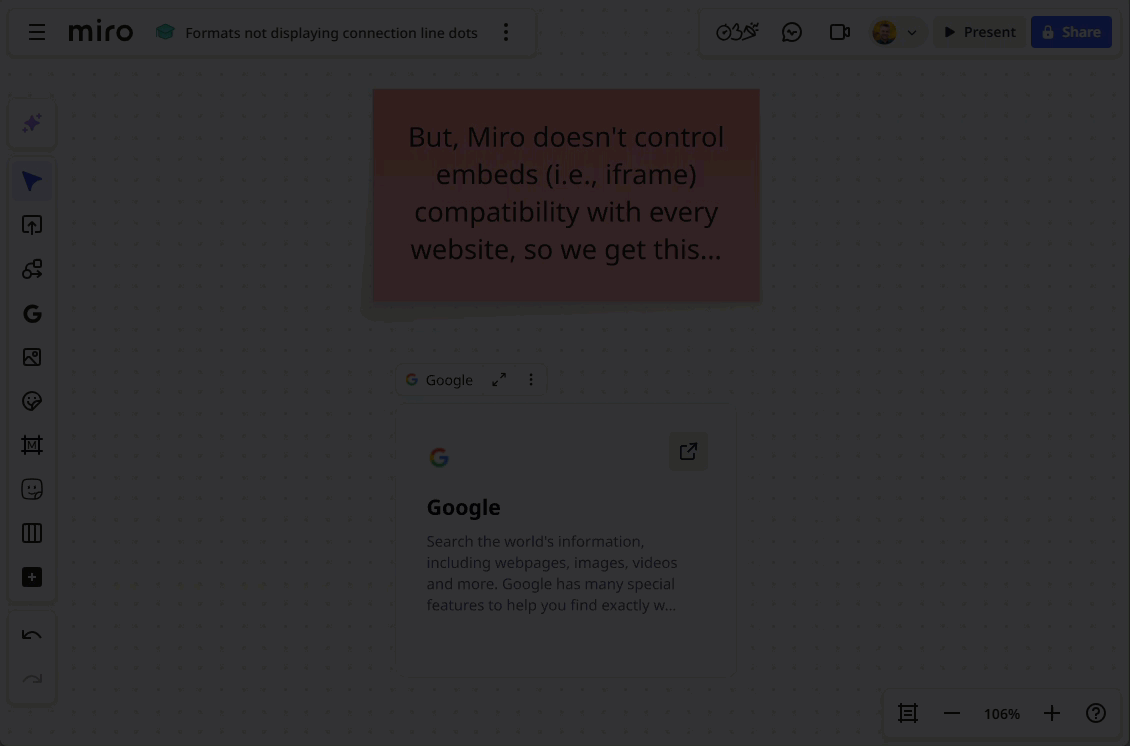 However, unlike 3rd-party embeds, where Miro likely has a business relationship to ensure an expected behaviour, e.g., Google Dos, Miro cannot control the fact that the external resource may not allow embeds via iframes, in which case something like this will happen: