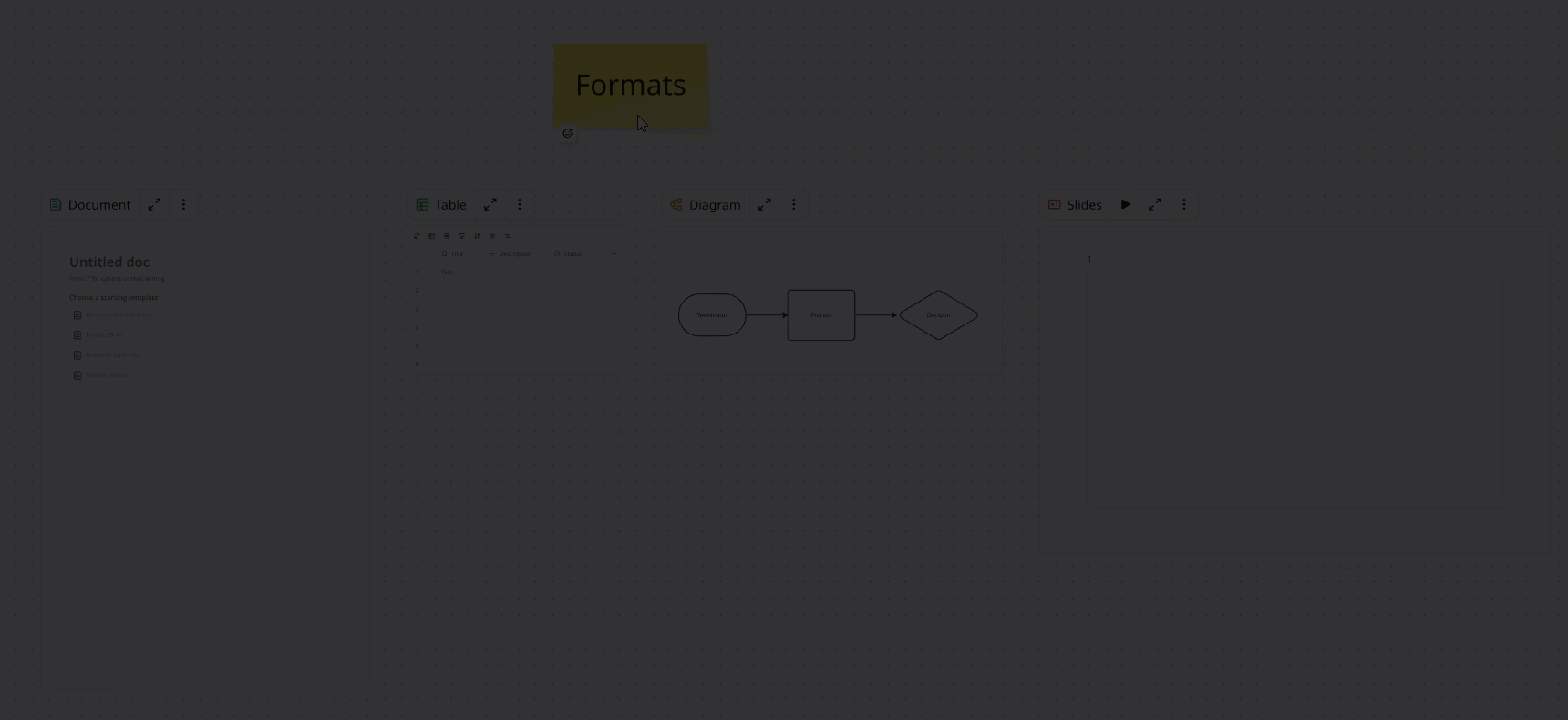 Formats come in several types, like Document, Table, Diagram, Slides, Kanban, Timeline, and even embedded external content (e.g., Google Docs, Sheets, or websites).