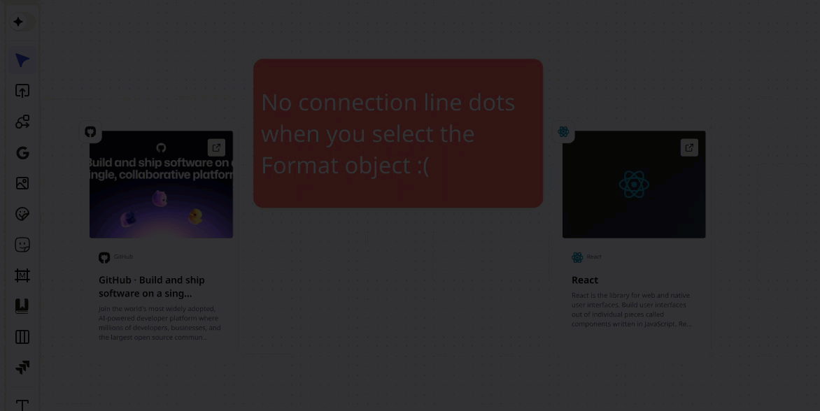 As this post highlights, the experience we are used to in Miro is that a selected Format-style object is not displaying the solid- blue connection dots, but does show the white-connection receiving dots. This, of course, is unexpected and and inconsistent experience.