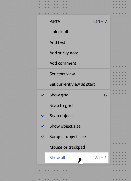 BTW, for anyone reading this, the issue was that there were two sets of objects spread very far apart on the board — some added by gruezi.max and some added by Miro (i.e., a template) at the time of board creation. The Show all was doing what it should, however, the items were so far apart that they were almost not visible. To confirm where objects were on the board, we did a Ctrl/Cmd + A to select all, and then moved one of the blocks of objects up beside the other.