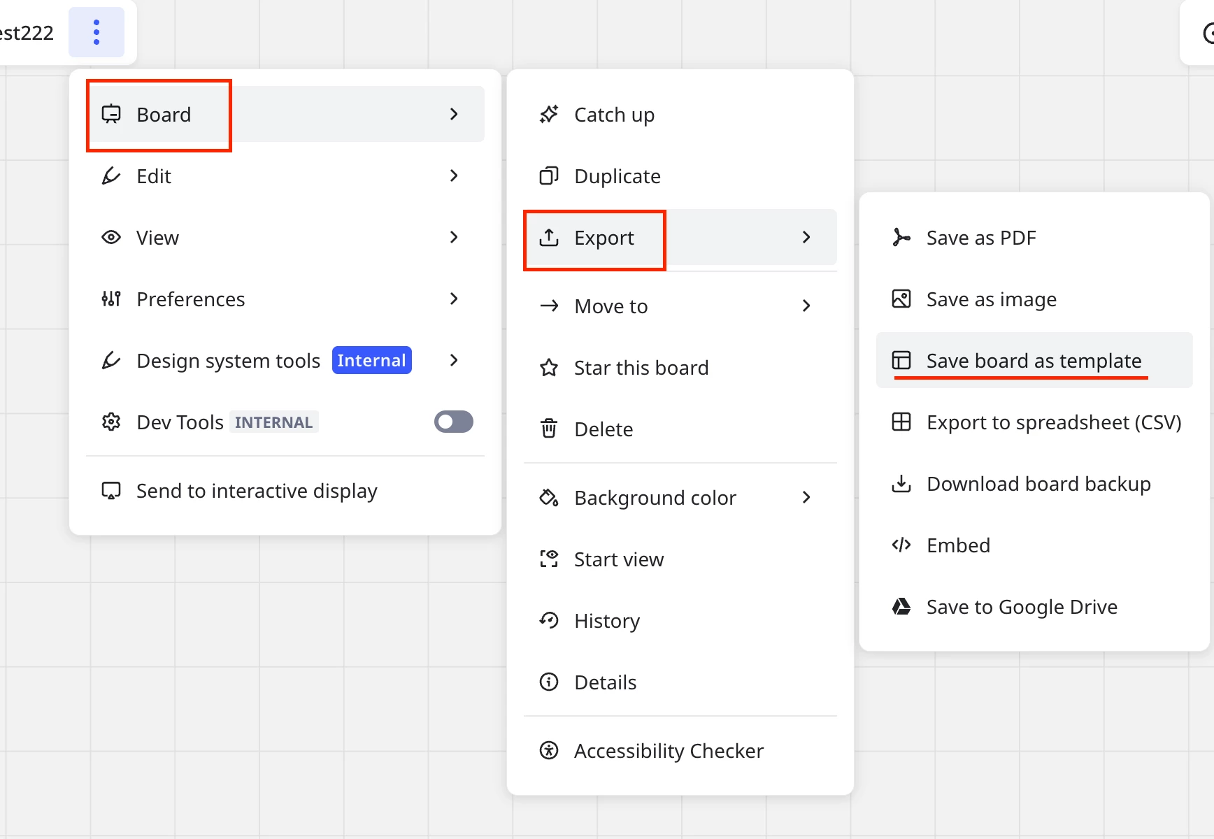 If you haven’t already, you can save your board as a template first by clicking “More actions (•••)” > Export > “Save board as template”. Once published, it will appear under “Custom templates” in the template picker so your team can easily access and apply it.