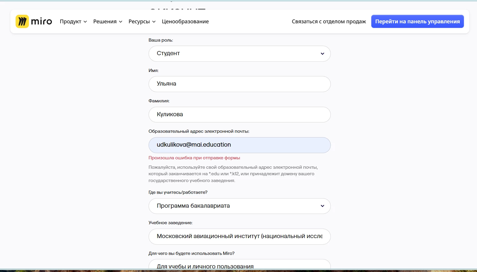 Verify your email domain – Miro’s Education plan typically requires a school or university domain (e.g., .edu or your institution’s official domain). Personal emails like Gmail or Yahoo usually aren’t accepted.