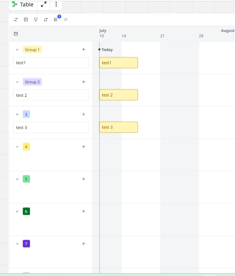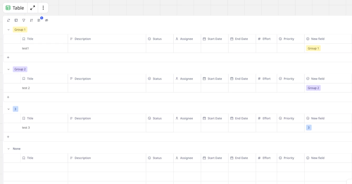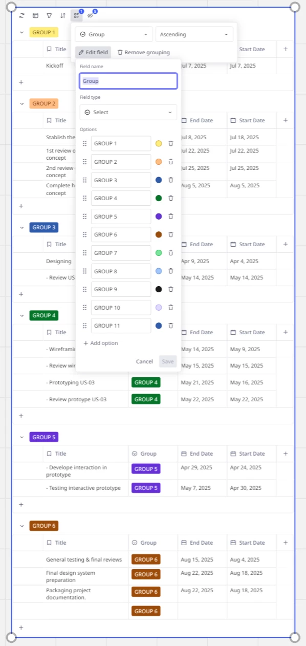 The groups you create in the Timeline layout will only appear in the Table layoutif they contain at least one record. In my example (see screenshots), I had 10 groups visible in the Timeline view. But in the Table layout, only Groups 1–3 appeared — because those were the only ones that had a task added.