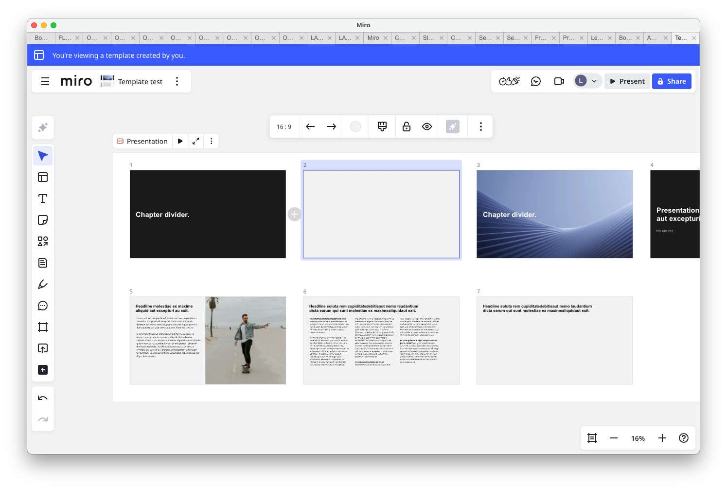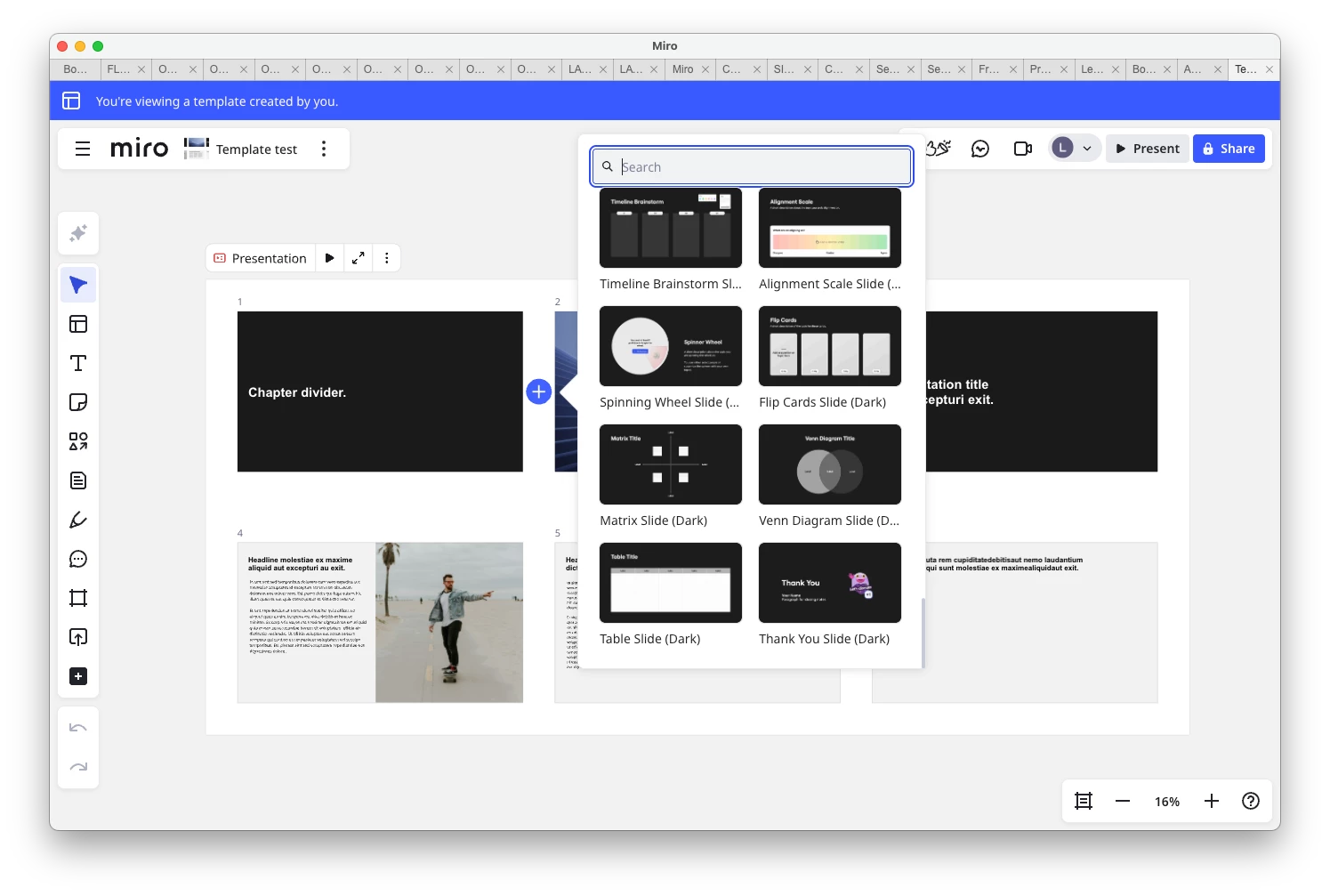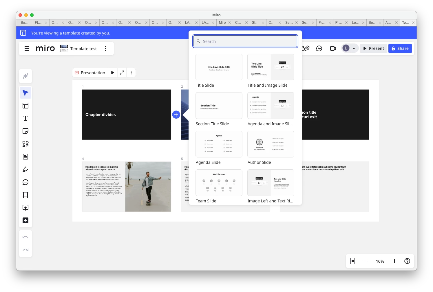 We have created a shared template with our company brand, style etc. When using the template I get a first set of slides on the board to work with, however, when hovering on the (+) sign next to a slide, or between two slides, I only find a Miro preset slide menu. How do I make our branded templates show up there to quickly build my presentation?