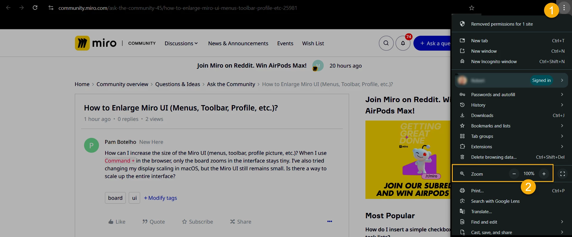 How can I increase the size of the Miro UI (menus, toolbar, profile picture, etc.)? When I use Command + in the browser, only the board zooms in the interface stays tiny. I’ve also tried changing my display scaling in macOS, but the Miro UI still remains small. Is there a way to scale up the entire interface?