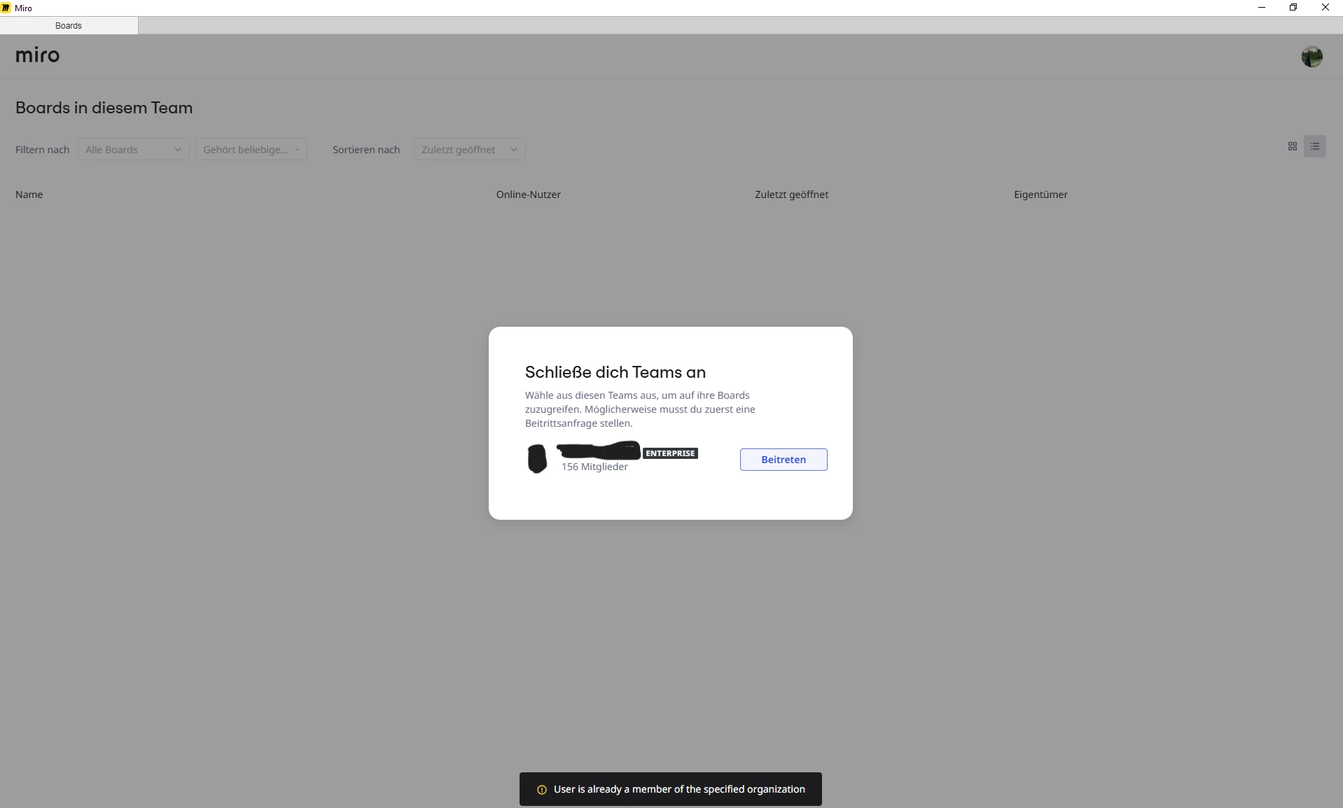When I try to access this board now, miro tells me to join that team again - but when I click on the link to join, miro says I am already part of the team?! (see screenshot, in german)