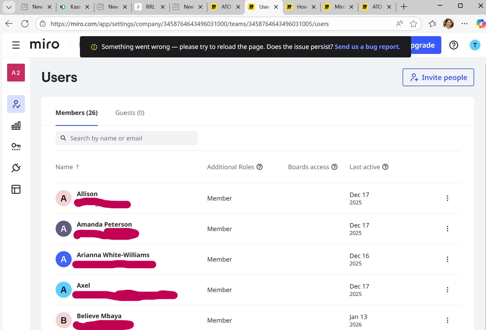 Hello, I have the exact same issue. I’m Team Admin with my own free plan of Miro. When I ty to remove/delete a team member i get the same message us the others have reported - that something went wrong, try to reload page - othewise send a bug report.