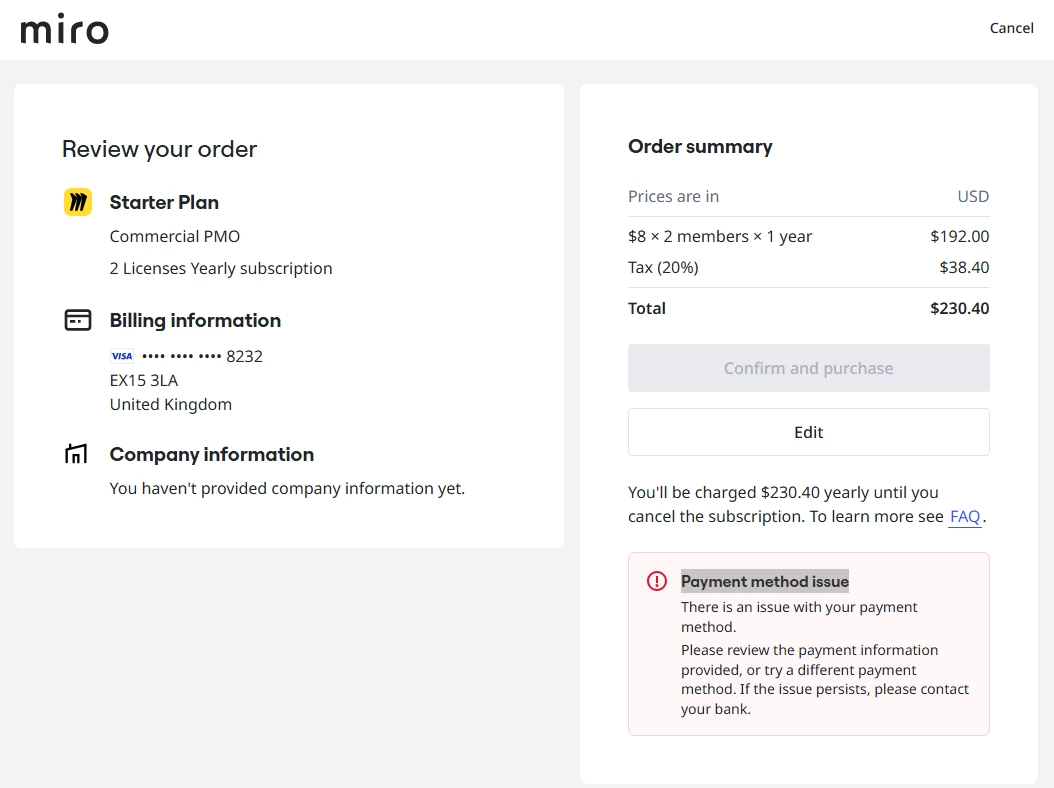 I am trying to purchase the Starter Plan for two users, I can confirm there are only 2 members in the team, but the payment is not getting through, I get the error message Payment method issue. I have cleared the cache, logged out and back in but no change. I have checked with my bank and my card is operational and they don’t see the transaction at all. Please can I get some support?
