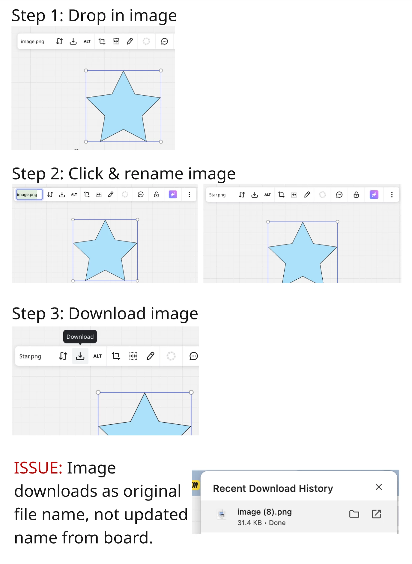 I have a board with a bunch of individual PNG’s, and my team members download these assets individually. I was asked to standardize the naming of each PNG, which I did in my Miro board. Come to find out, when you download the images from the board, they’re still saving as their original file name! Is there any way to save images as their updated names from the board?