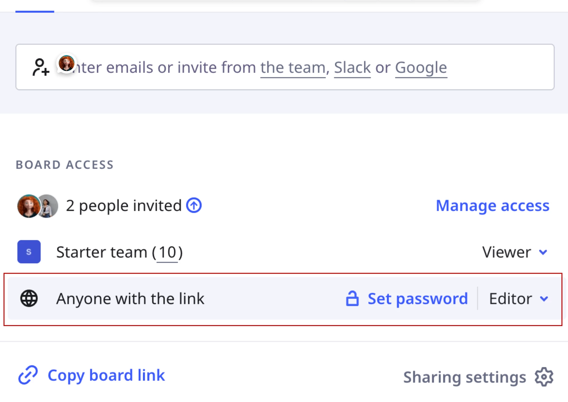 We are on a Starter plan and want to share a board via the Public Link and a password (with editing rights), to non-registered MIRO users. From what I have read they should be able to select the public link, and the MIRO board appears at which point they need to enter the MIRO board password - no login required.