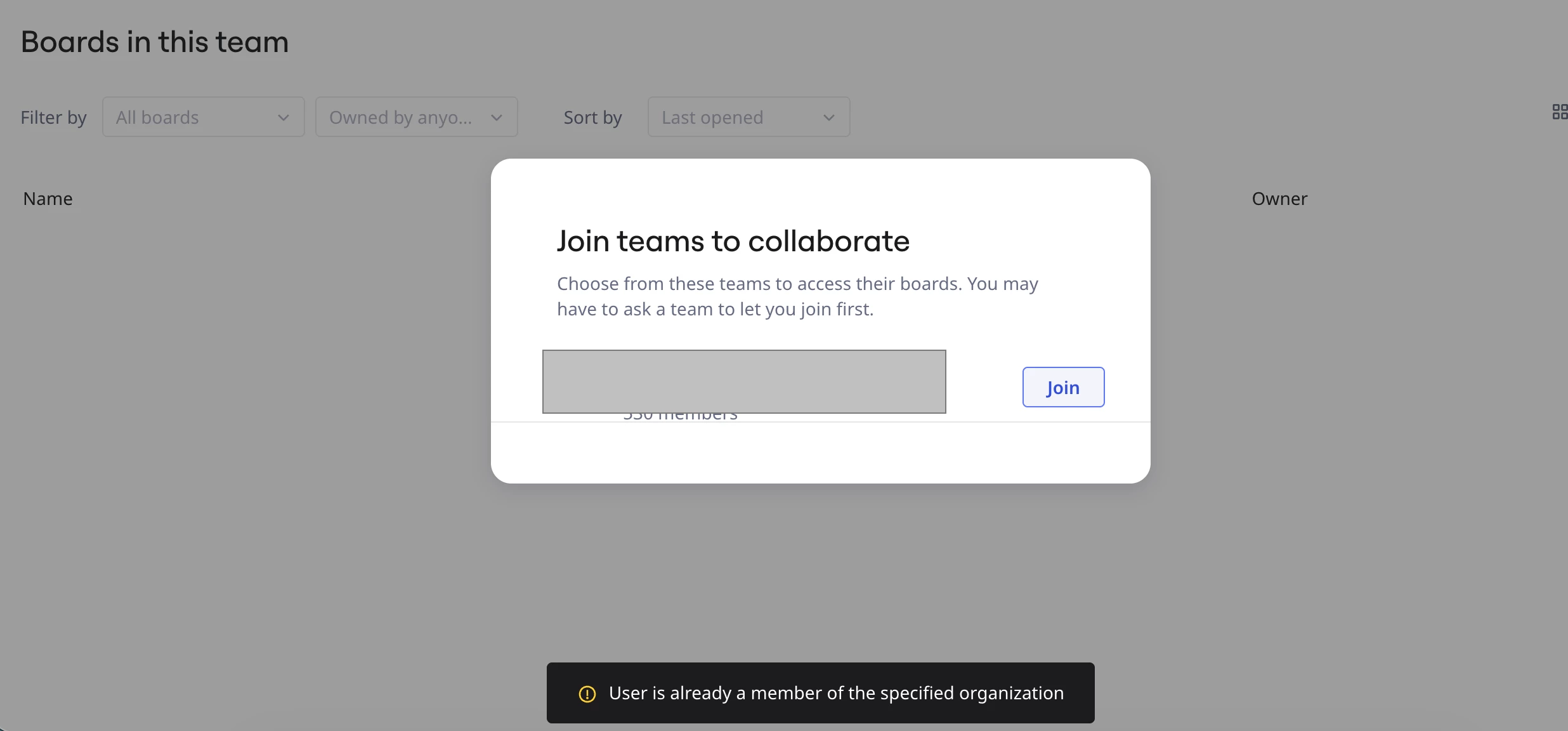 When I click Join, at the bottom I get a black banner saying: “User is already a member of the specified organization” and the popup stays on the screen.