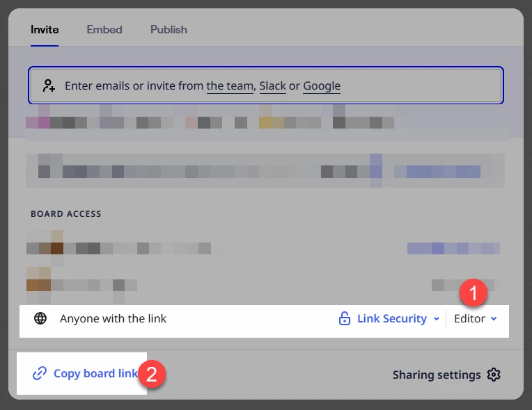Then, set the board’s Share settings to “Anyone with the link” to Editor and send them the link.