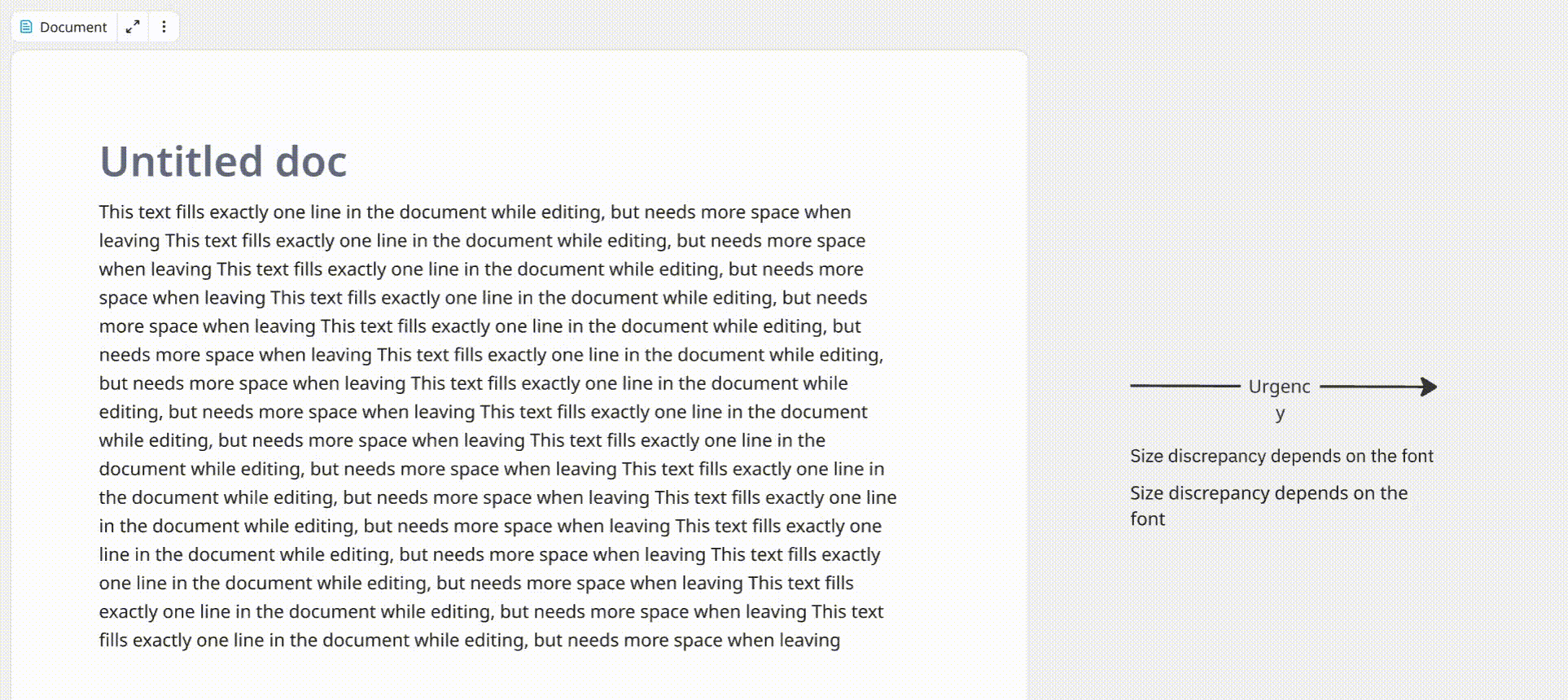 Severity depends on the font, so a workaround for many cases is to use Arial or IBM Plex Sans (closest match) rather than Noto Sans (largest discrepancies). The overhang can be worked around by adding a space at the end. That space, however, gets deleted on the next edit operation, so this is tedious. And documents don’t seem to allow changing the font.