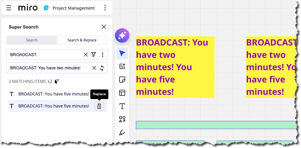 What I really need is a way to make announcements directly inside the active Miro board. It would be amazing if the facilitator could send a message that flashes or pops up near the timer, letting participants know there's an update while they work.