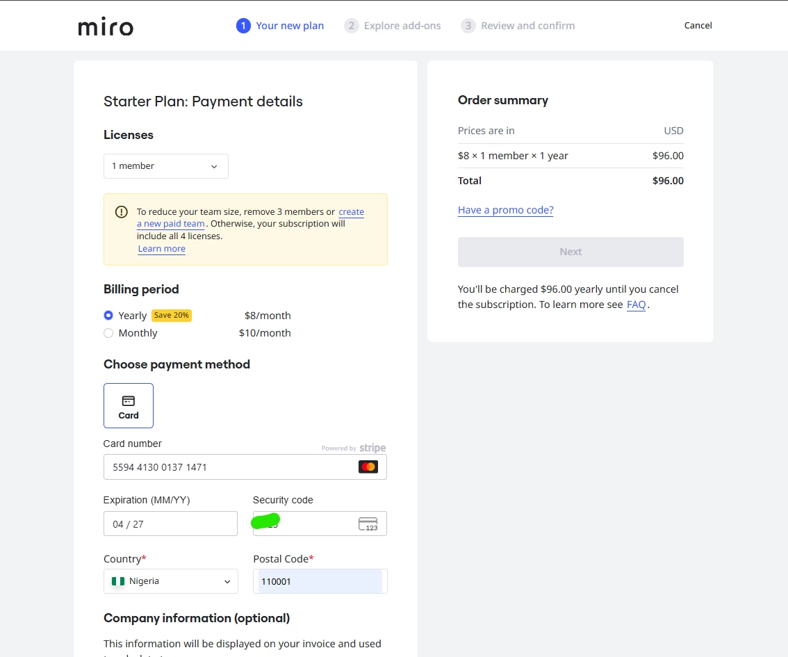 I tried upgrading my free plan to the starter plan, but the “Next” button is not activated after filling in the payment details. Is there anything I am missing? Kindly treat this as urgent.