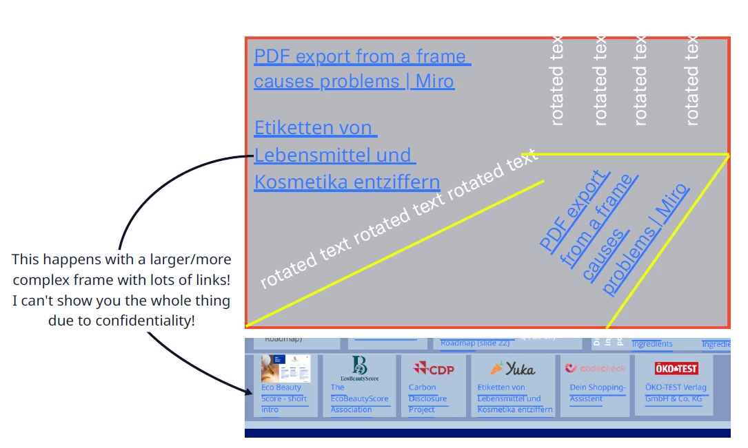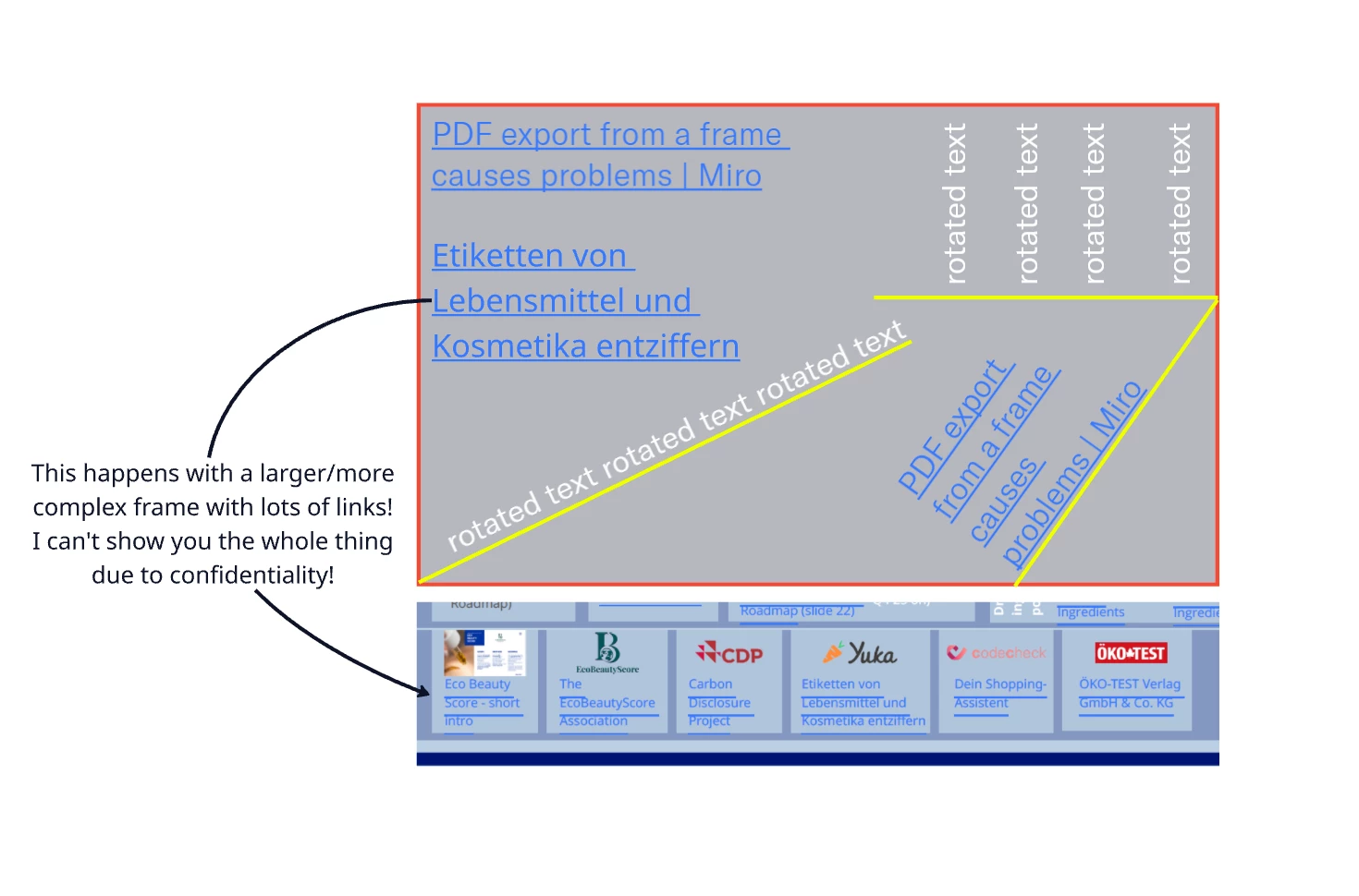 Hi, what's going on with Frames' PDF export? Rotated text causes absolute chaos in the PDF and the link underlines are rendered shifted. This happens to all the users I know and only since the last update. Can you fix this again? I use this feature very often to share content with clients.