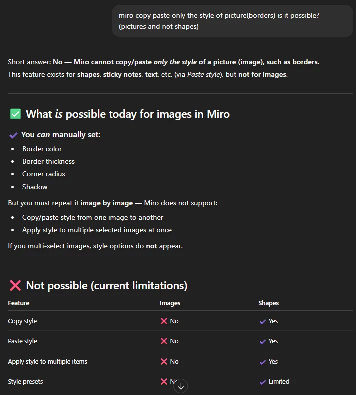 Currently, Miro allows copy/paste style for shapes, text, and sticky notes, but not for images. When working with multiple pictures, it’s not possible to copy only the style (border, thickness, color, corner radius, shadow) from one image to another.