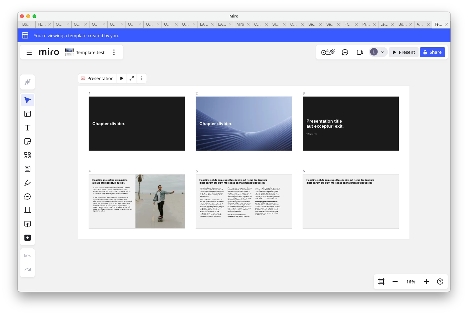 The pop-up menu in a slide presentation can’t be edited by a user, it only shows Miro predefined templates. So even if I use a branded template, the options to add more slides only allows Miro styled slides to be added this way. If I simply click the (+) symbol in between slides, a blank page appears.