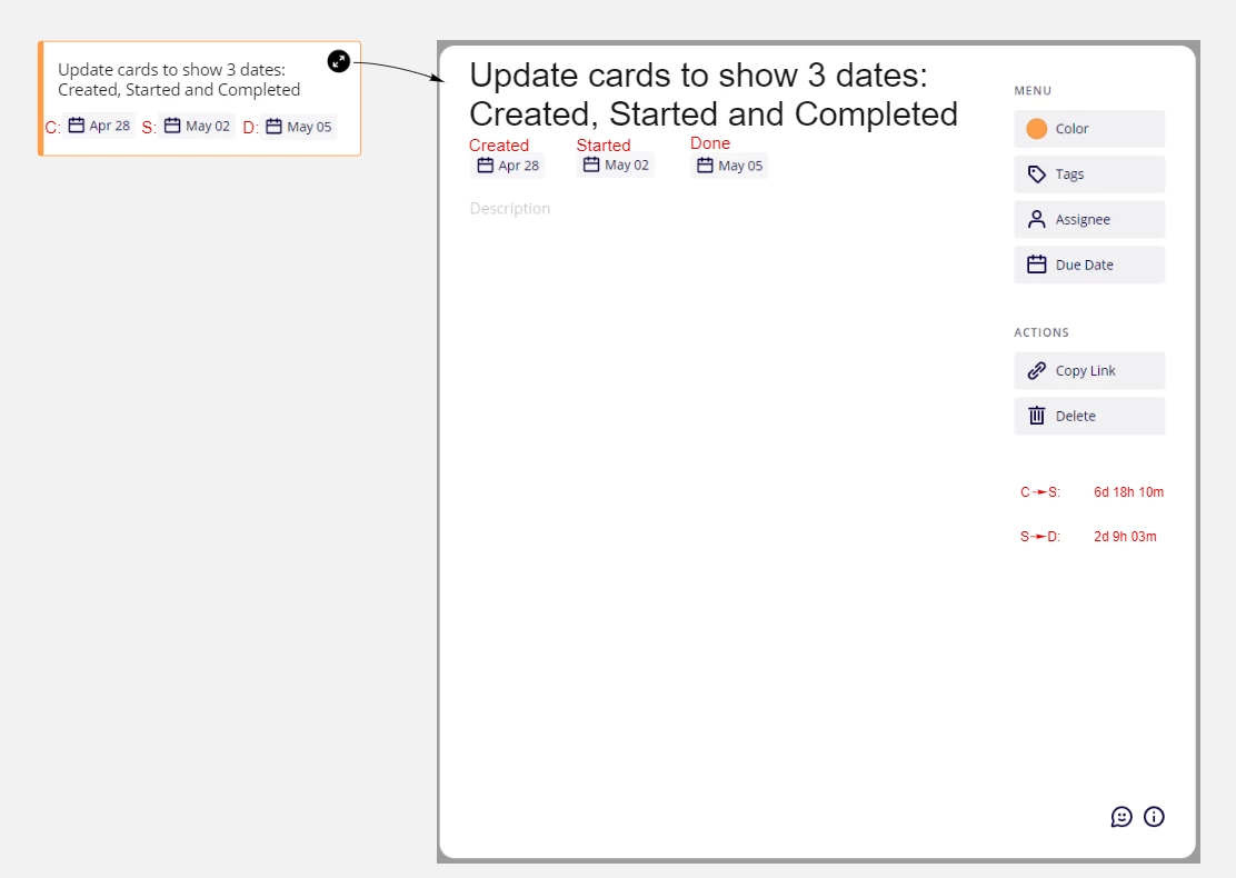 Update the card type to show 3 dates: the date/time it was created; the date that the work shown on the card was started; and the date that the work was deemed ‘done’. Also show the calculated lead time (created to done time) and the calculated cycle time (started to done time).