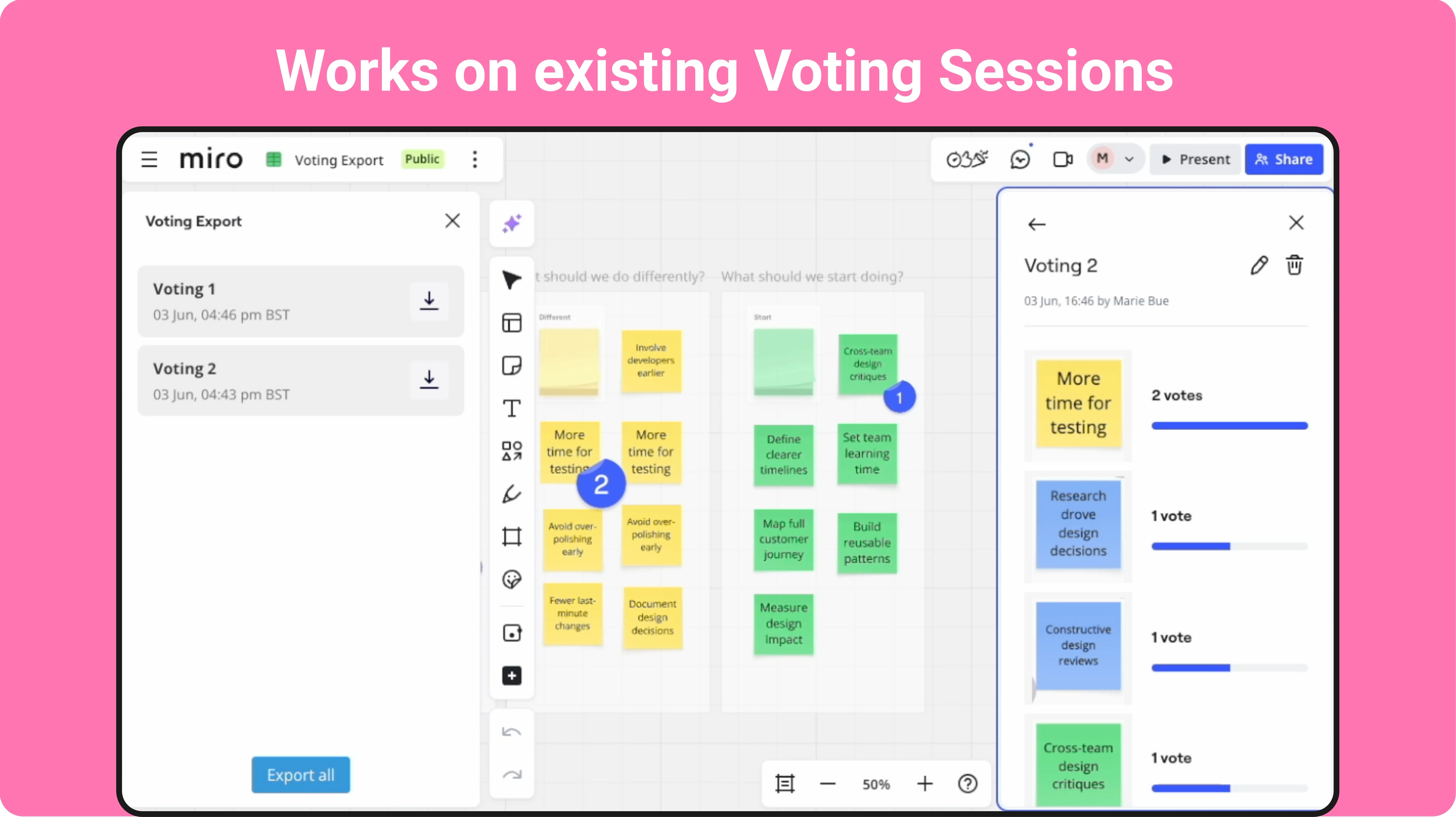 Exporting votes would be nice, but for me just to retain them in Miro would be helpful. If there was a way to keep the Vote Results lingering visually as we move on and do other things to the board. And be able to toggle them on and off. For me just one result being retained would be enough. Like a SHOW LAST VOTE function that re-displays the numbers on the objects they are attached to, even when the object is moved.