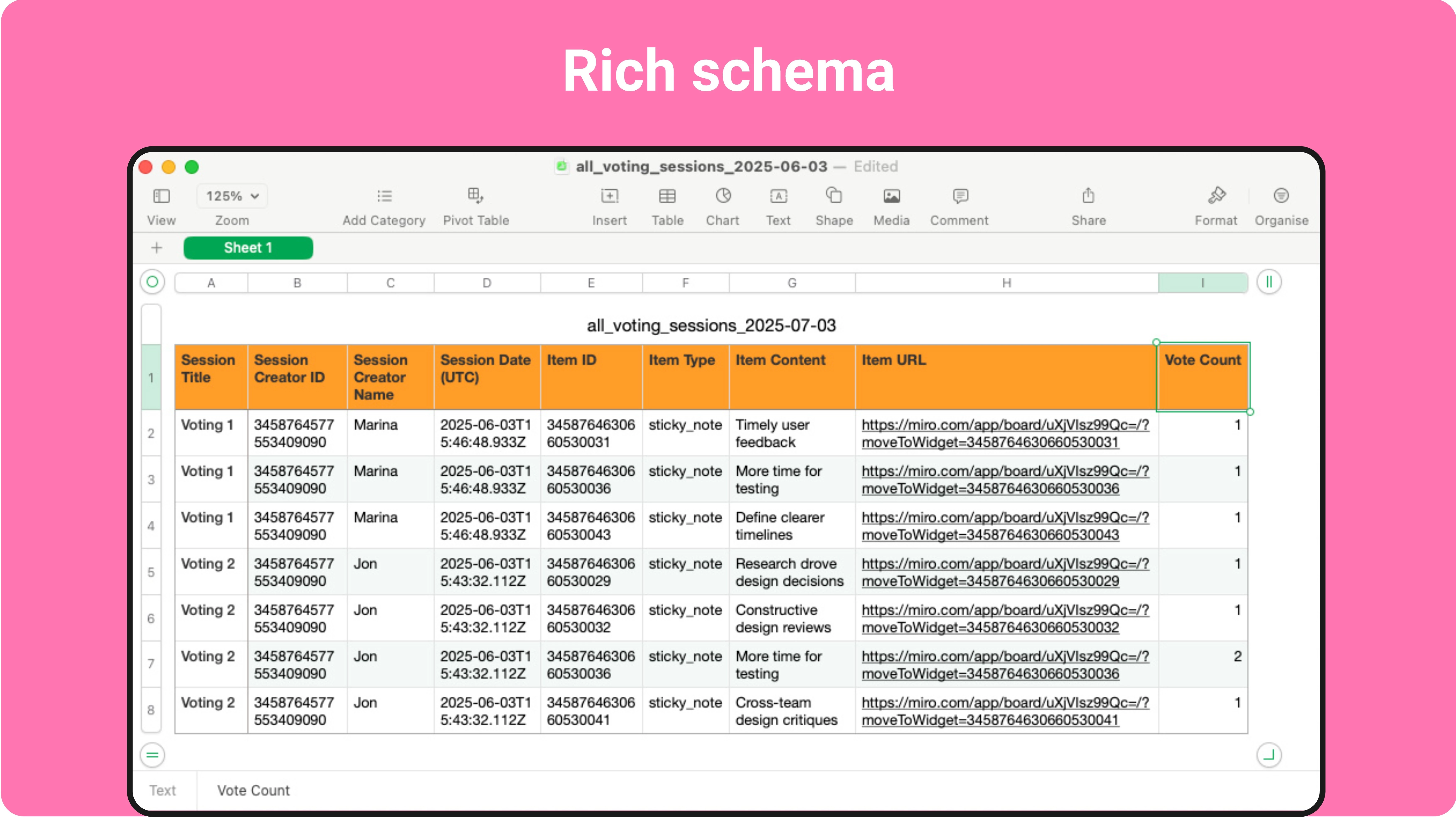 Rich data schema: session metadata plus object ID, content, board URL and vote count
