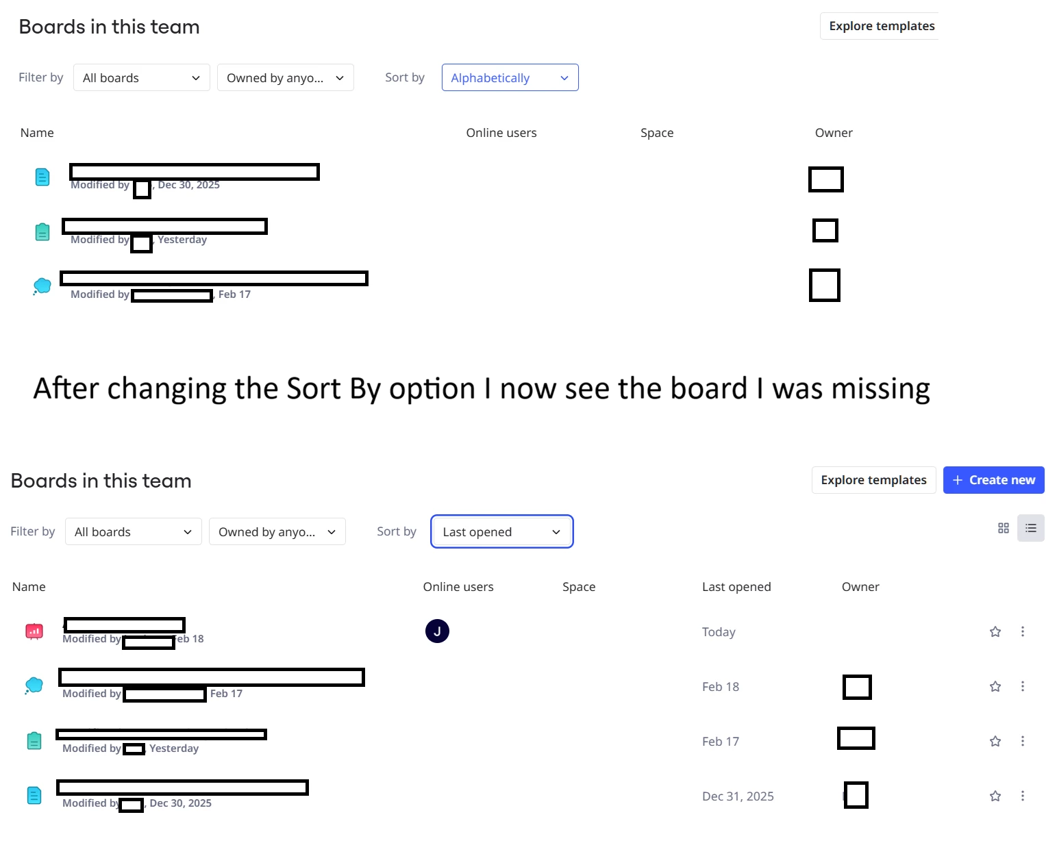 I thought this may be browser caching but I did a hard reload of the site with developer tools open and it does the same thing. Also I think the missing board (red icon) only showed up in the “Last Opened” filter after I opened it from a direct link that someone gave me.
