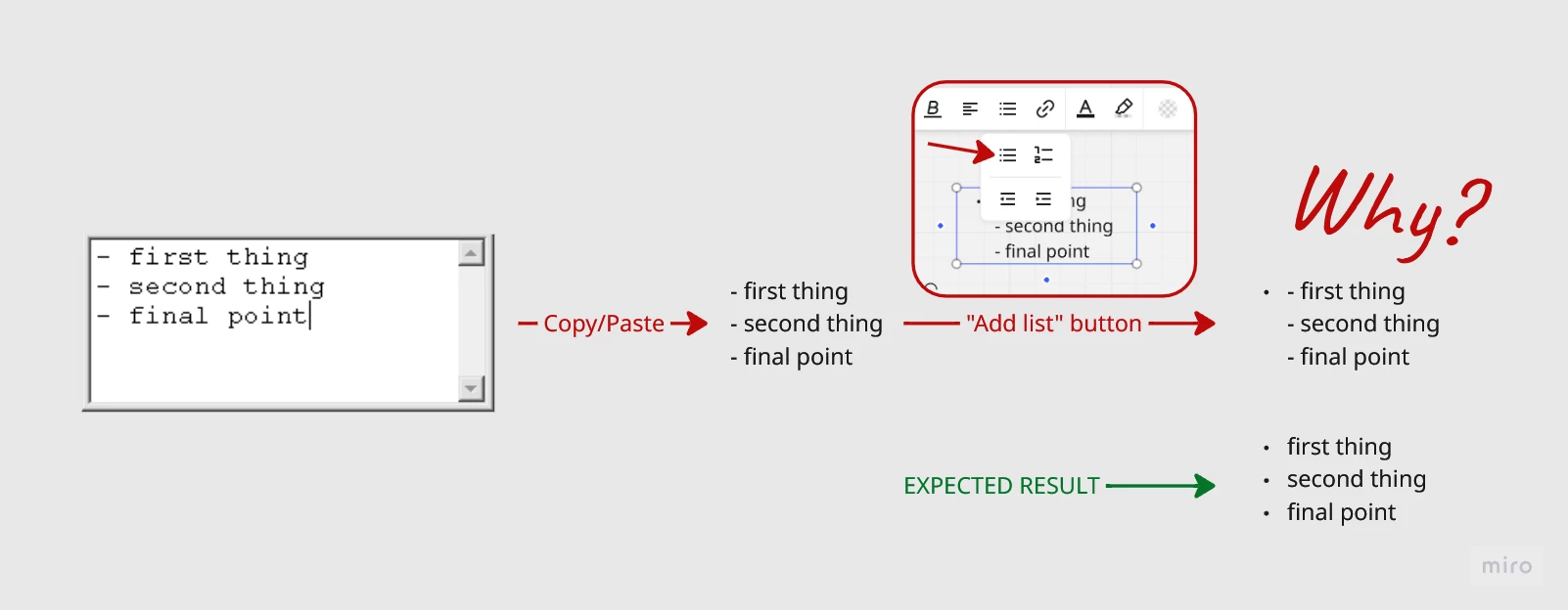 I often find myself copying and pasting a bulleted or list of notes into Miro. Each line represents an individual thought that I want to manipulate for a variety of reasons—not a block of text. If I want to separate this list, I have to cut and paste each line into its own text object. I’d love to have an option that broke those items out (based on bullet or carriage line return) into their own separate objects automagically—like Miro does with Cells and Post-Its.