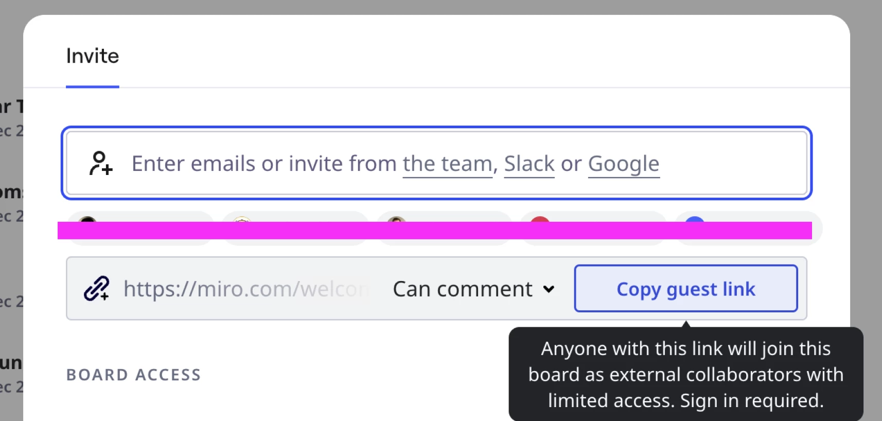 Problem: For those of us using guest share links via fixed sources such as emails, pdfs, other Miro boards or saved as quick snippets in our notebook, this is frustrating