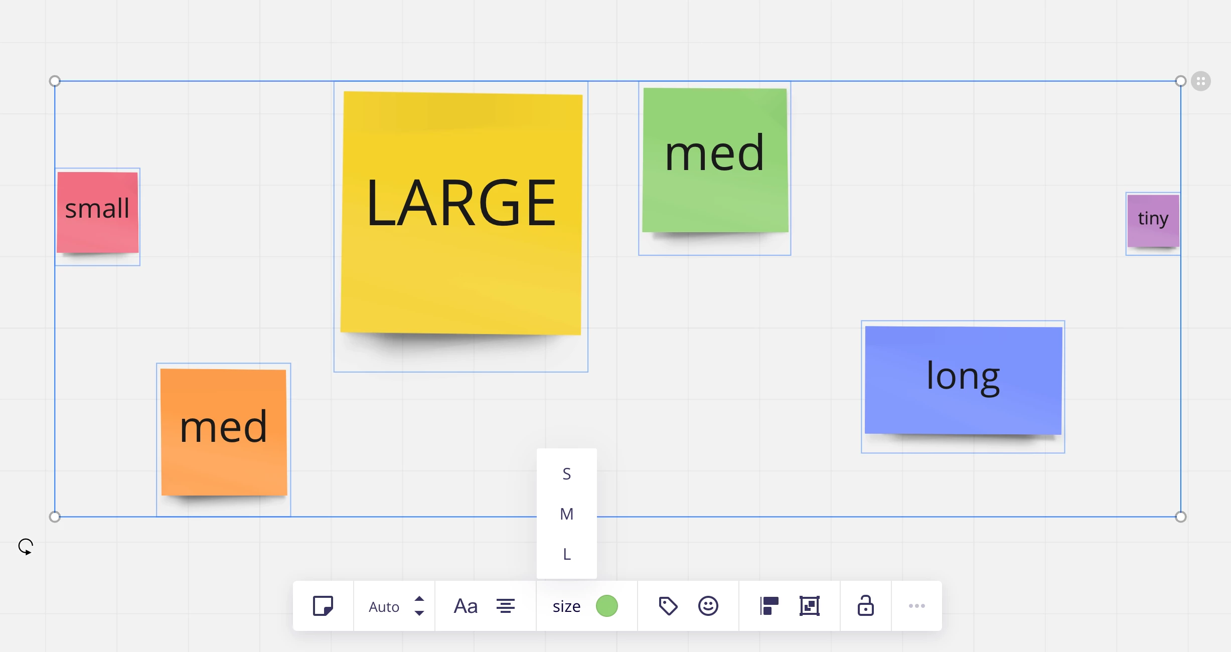 The standard post-it sizes typically do not work for us and we end up creating our own sizes. However, I’m having a hard time getting a team of people to use consistent sizing for their post-its. They create them in all different sizes for no reason at all and I end up having to go back and resize a ton of post-its. There should be an easy way to either copy/paste formatting of post-its (e.g. size, color) or create custom sizes so that we can have more consistency in the boards and not waste so much time on tedious tasks like this.