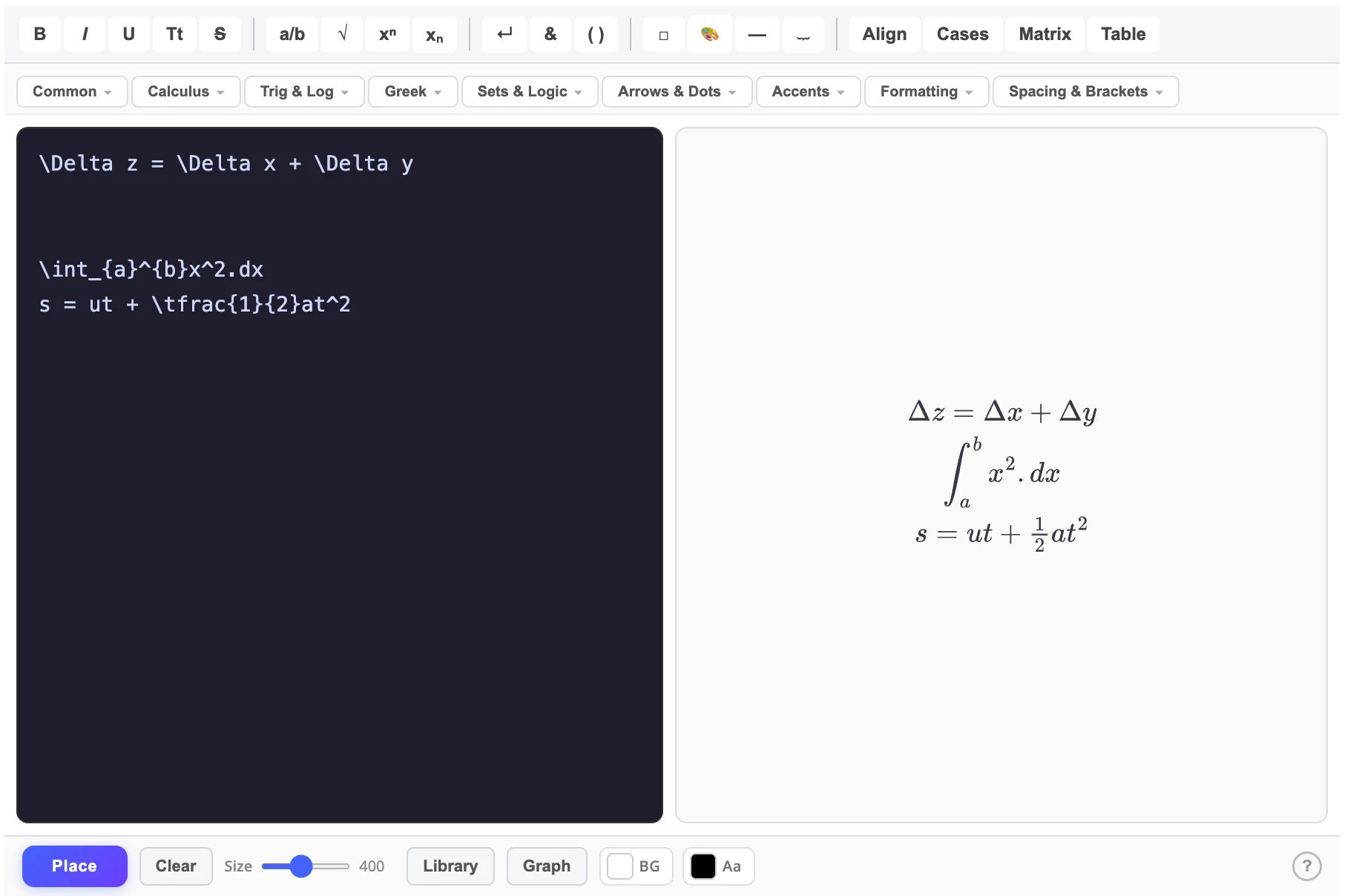I’ve written a Miro addon that renders LaTeX math expressions to images you can then drag and drop to your boards. It also includes the option to toggle the input mode from plain tex to the excellent MathLive equation editor widget.