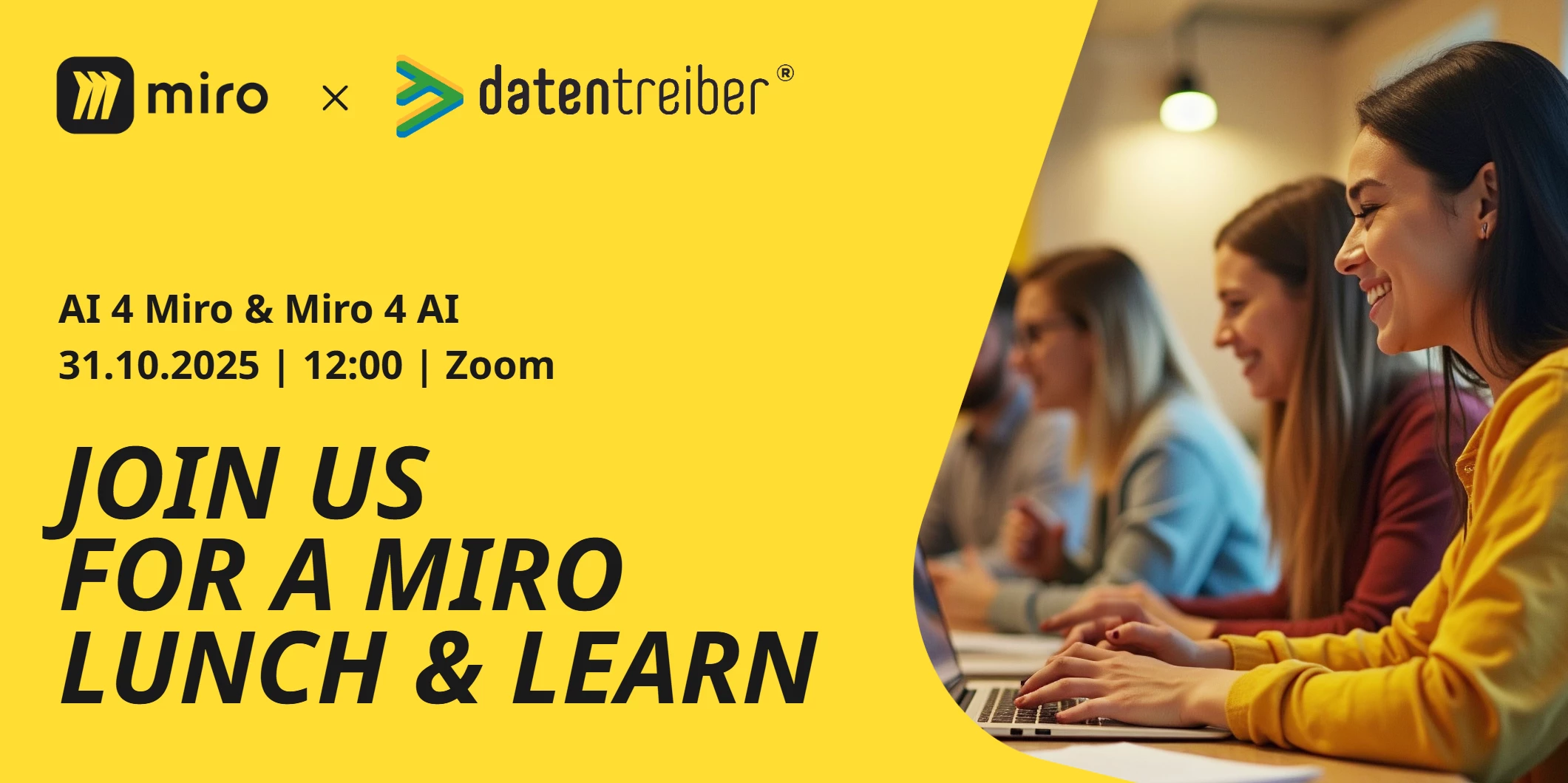 Miro + AI = Dream Team! Miro lets people collaborate and AI join in as a sidekick. At our Miro Lunch & Learn on October 31 at 12:00 pm, we will show you in an interactive session how you can collaboratively design your AI strategies & solutions and accelerate the design process with Miro AI.